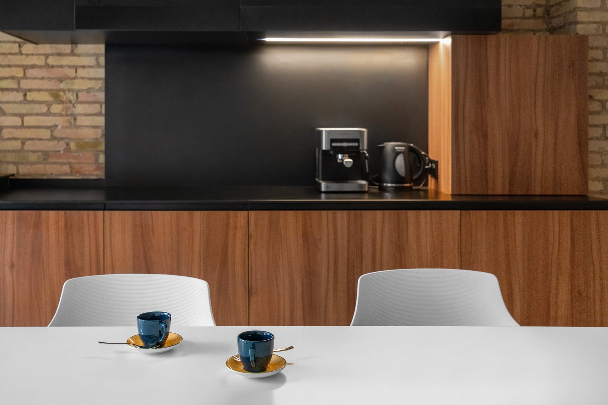 La arquitectura recupera los elementos estructurales originales —muros de ladrillo, pilares de hormigón— poniéndolos en diálogo con materiales técnicos de alto rendimiento y una iluminación precisa. El mobiliario a medida y los acabados en tonos neutros, madera y negro mate refuerzan la identidad visual de la marca, aportando sobriedad y calidez al conjunto.
