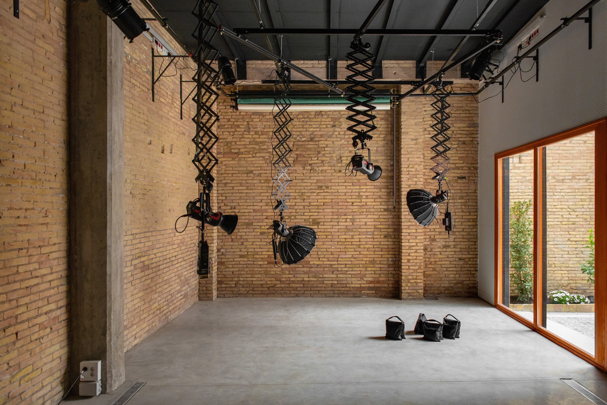 El programa incluye plató de rodaje, estudio de grabación y posproducción, sala de reuniones/oficina, espacio de coworking, zona común con office y patio ajardinado, articulados en torno a un espacio central que conecta la entrada con la luz natural del patio posterior.
