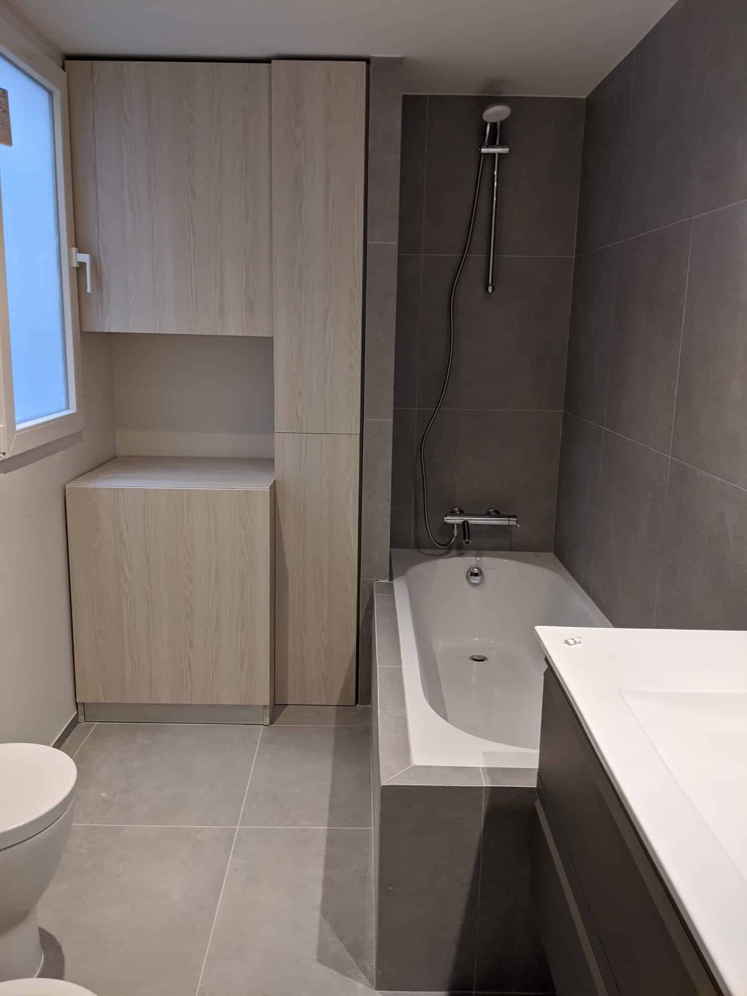 Se sustituyó toda la instalación eléctrica, incorporando iluminación empotrada LED de gran confort visual (modelo Tolva de Nexia) y mecanismos Jung LS990, integrados con discreción en los paramentos. Los nuevos pavimentos porcelánicos, de textura cemento y acabado mate, aportan continuidad visual y refuerzan la sensación de amplitud.