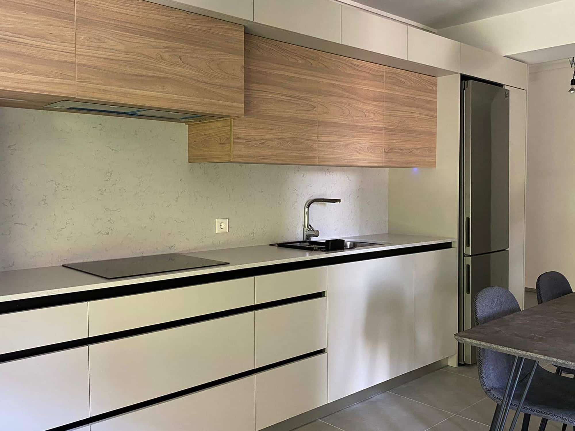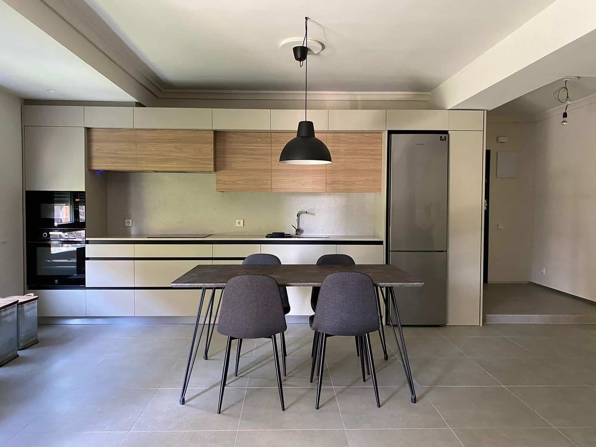 La cocina se concibe como un espacio abierto y neutro, con mobiliario en tonos piedra y madera clara, combinando precisión técnica y calidez doméstica. En los baños, el uso de revestimientos cerámicos y muebles en melamina estratificada —modelo Ithaca Box de Codis— unifica el conjunto con un lenguaje sobrio y atemporal.
